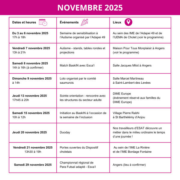 Adapei 49 Actualités Les événements 2025 - 2026 de l'Adapei 49 Partager cette page : Posté le : 14/10/2025 Tags : #Association #Évènements Catégories : Les événements 2025 - 2026 de l'Adapei 49 en cours de rédaction en cours de rédaction