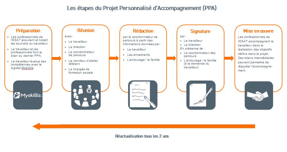 Le projet personnalisé représente l’outil indispensable à la relation d’accompagnement du travailleur par les professionnels de l’ESAT. Adossé au contrat d’aide et de soutien par le travail en qualité d’avenant, il vient préciser les modalités d’accueil et d’accompagnement du travailleur. Celles-ci sont élaborées conjointement par le travailleur, son entourage et les professionnels de l’ESAT.