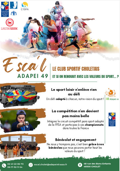 Une licence FFSA (Fédération Française de Sport Adapté) au club sportif Choletais d’Esca’l, c’est donc de l’activité physique adaptée, encadrée par une enseignante diplômée, mais surtout l’occasion de découvrir et de profiter de l’exceptionnelle offre d’activités sportives de votre territoire.