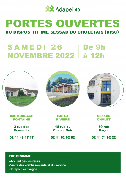 Les Portes Ouvertes du DISC (Dispositif IME SESSAD de Cholet) auront lieu samedi 26 novembre 2022 de 9 h à 12 h.