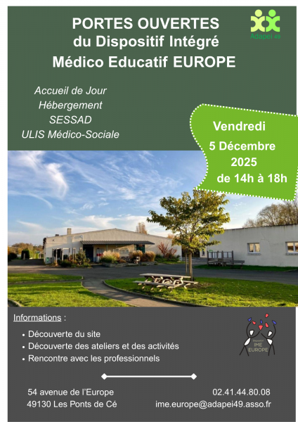 Adapei 49 Actualités Portes ouvertes du DIME Europe Partager cette page : Posté le : 07/10/2025 Tags : #DIME Europe #Portes ouvertes Catégories : Portes ouvertes du DIME Europe Les portes ouvertes du DIME Europe auront lieu le vendredi 5 décembre de 14h à 18h. Celles-ci sont destinées aux partenaires et futures familles interessées par notre établissement.