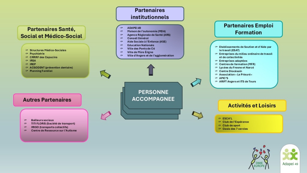 DIME EuropeNotre établissementLes partenaires Partager cette page : L'autorisation Les modalités d'admission Les prestations du DIME Le SESSAD L'accueil de jour L'hébergement L'ULIS médicosociale L'organisation au quotidien Les professionnels Les équipes d'accompagnement L'équipe de direction Les services généraux Les services supports Le Conseil de la Vie Sociale Les partenaires La taxe d'apprentissage Contact Nos Partenaires